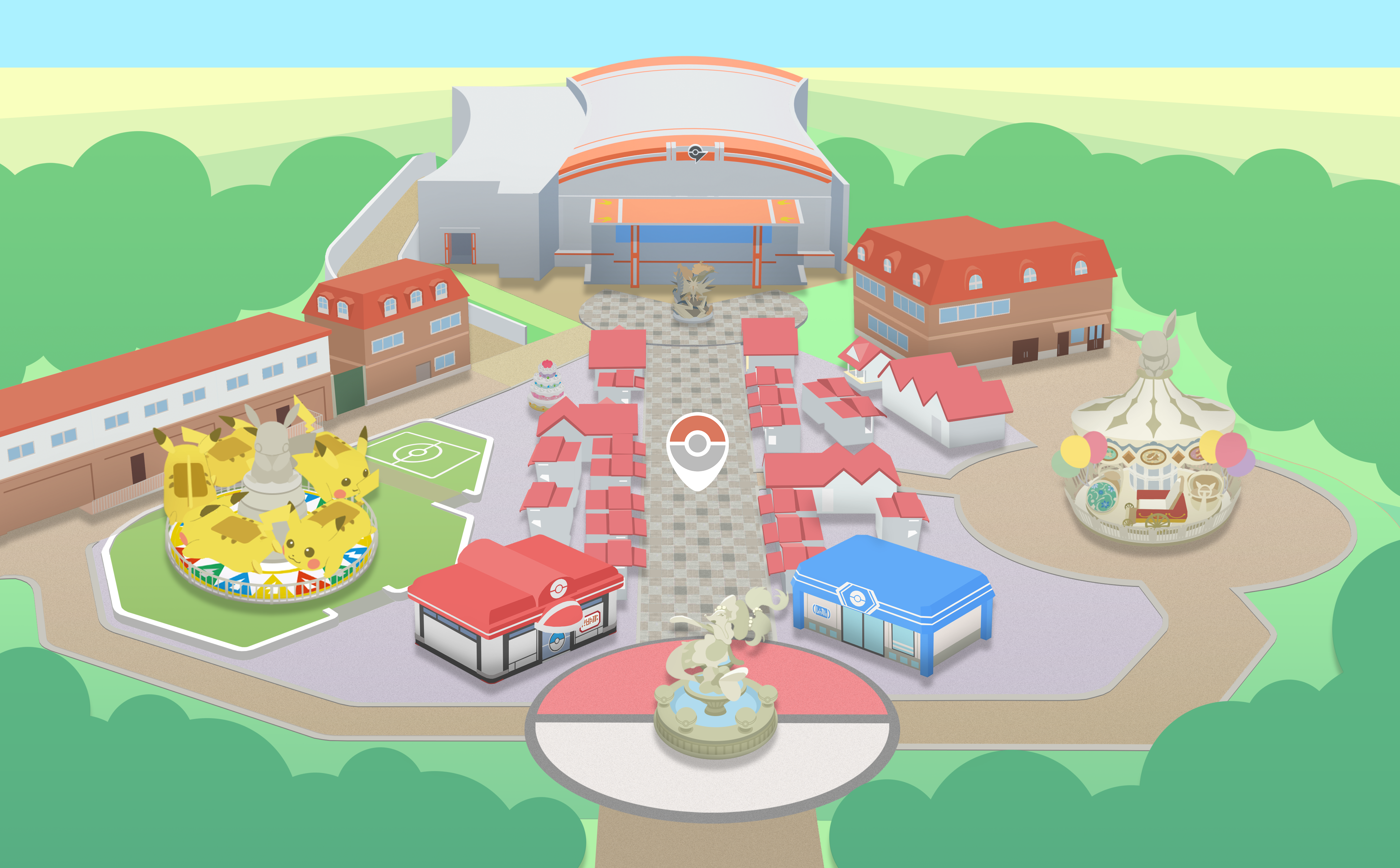 A variety of Pokémon friends including Pikachu and Eevee parade through Sedge Town. All Trainers are invited to join in the fun along with the town's Pokémon residents.